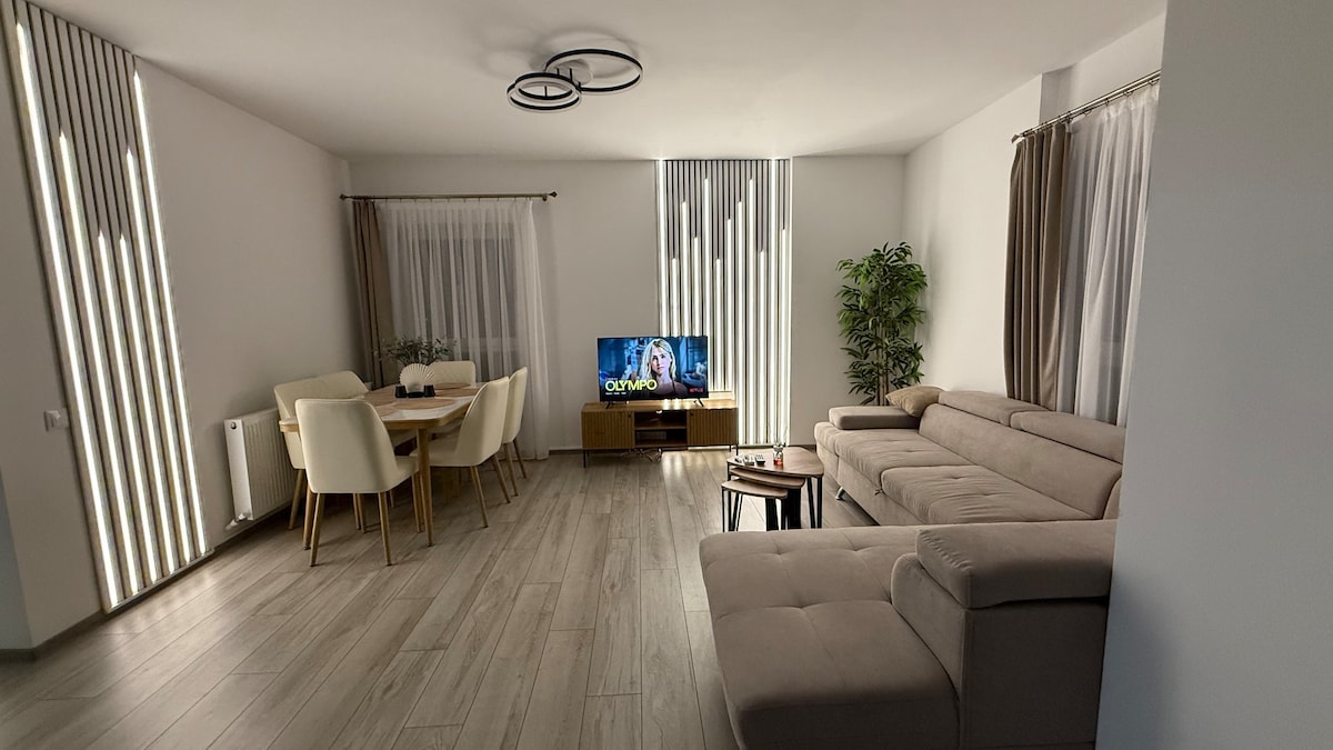 Acest apartament recent renovat îmbină designul modern cu o atmosferă caldă, astfel încât oaspeții să se simtă cu advărat ca acasă. Dispune de aer condiționat, încălzire termică, bucătărie complet utilată. Apartamentul beneficiază de o amplasare excelentă, fiind situat în apropierea unui parc și unui supermarket pentru cumpărături rapide, de asemenea se află în vecinătatea Spitalului Județean, ceea ce îl face o alegere practică.