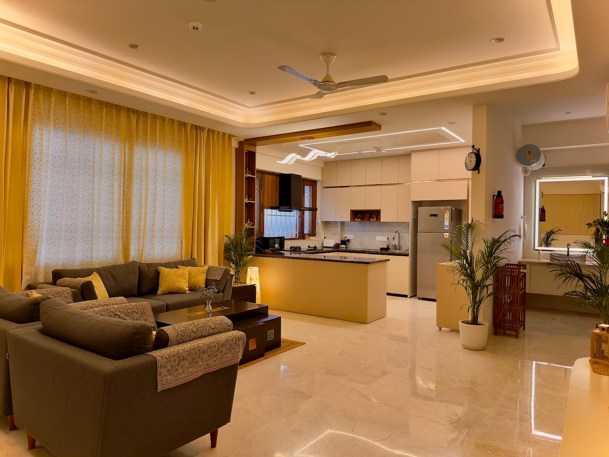 Welcome to our cozy penthouse on the second floor, with private entry and a charming patio. The home offers 2 air-conditioned bedrooms, each with a King bed, 2 bathrooms (one attached, one in the living room), a kitchen with RO water filter, and a small common area with a refrigerator. High-speed Airtel Wi-Fi and a work desk are also provided. Please note: If booking for 1-2 guests, 1 bedroom and bathroom will remain closed for a more tailored experience.