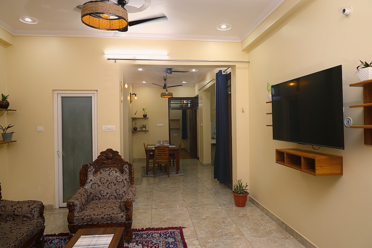 Welcome to our cozy penthouse on the second floor, with private entry and a charming patio. The home offers 2 air-conditioned bedrooms, each with a King bed, 2 bathrooms (one attached, one in the living room), a kitchen with RO water filter, and a small common area with a refrigerator. High-speed Airtel Wi-Fi and a work desk are also provided. Please note: If booking for 1-2 guests, 1 bedroom and bathroom will remain closed for a more tailored experience.
