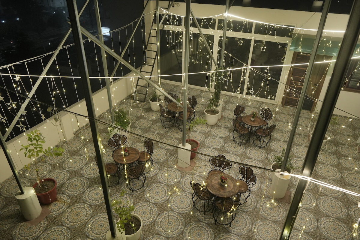 You get a private rooftop living room with kitchen, 2 rooms, 2 washrooms, fridge, geyser, Wi-Fi, AC & all amenities. Rules: 1. Smoke only on terrace. Burns on sofa/bed ₹2500 2. Spitting on walls/floor ₹2000 3. No shouting on terrace; mess = immediate checkout 4. Food/vomit spill on bed, pillow, duvet, sofa ₹1000 each 5. Vomit on floor/washroom ₹500 6. Checkout: 10:00 AM Amenities chargeable: Bonfire -1000/- with materials Barebque -1500/- with materials