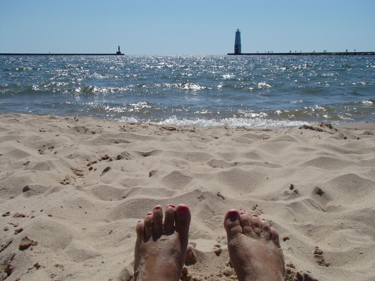 Welcome to THE NEST" Condo with DIRECT gorgeous views of Frankfort's iconic Lighthouse with SUNSETS on the sandy BEACHES of Lake Michigan at Harbor Lights Resort. Definitely a world class view for you! A quick 2 block stroll to the QUAINT downtown Frankfort. Enjoy a quiet night's sleep in a very large bedroom with two comfy, queen sized beds. Up north style Livingroom with featured gas FIREPLACE. Large DECK with open view of Beautiful Lake Michigan Heated Pool and relaxing hot tub available
