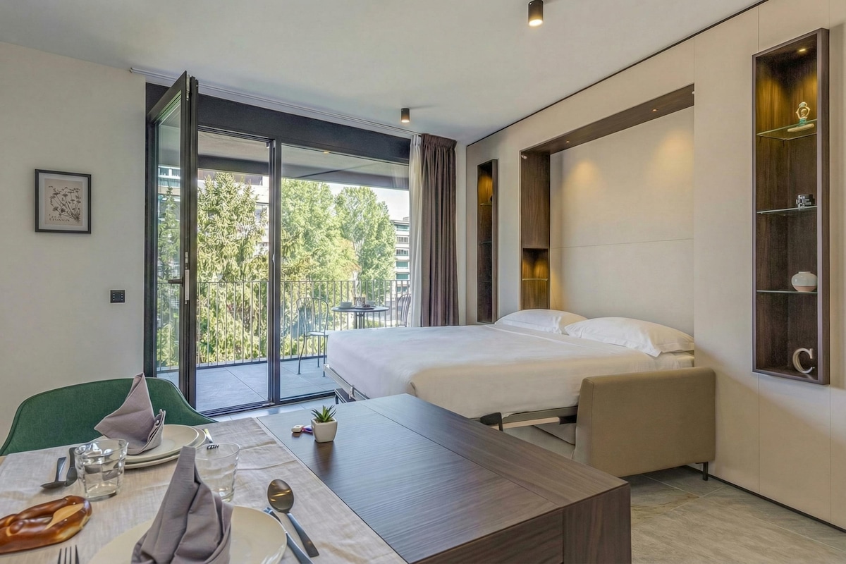 Stylish contemporary studio apartment in the university heart of Lugano, ideal for short or long stays. The apartment offers a perfect balance between relaxation and design, featuring a furnished balcony and a fully equipped kitchen. The building includes a free gym and video surveillance. Breakfast service can be included for monthly contracts, with additional services such as cleaning and laundry available upon request.