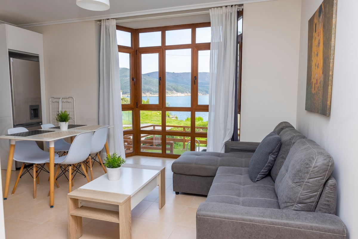 A pocos metros de la playa de la Rapadoira. 2 dormitorios con cama de matrimonio, otra cama plegable, 2 baños. Con piscina en temporada de verano, pista de pádel. Conexión a Internet Wifi. Netflix.