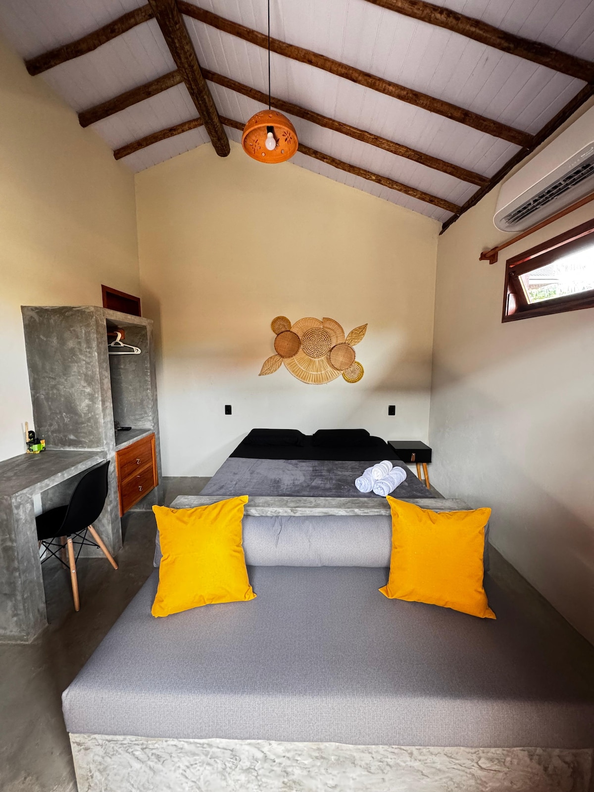 Uma casa com um ar de rusticidade e conexão com a natureza pra deixar tudo mais agradável. A casa conta com espaços amplos, 3 andares e uma área de convivência adorável. Ar condicionado ,frigobar e tv na suíte principal, na outra temos climatizador e camas de solteiro. Cozinha com fogão, geladeira, microondas. Temos um mirante com uma vista incrível para ser apreciada de uma redinha. Estamos bem localizados a poucos metros da praia ,tudo pode ser feito a pé. Não temos estacionamento.