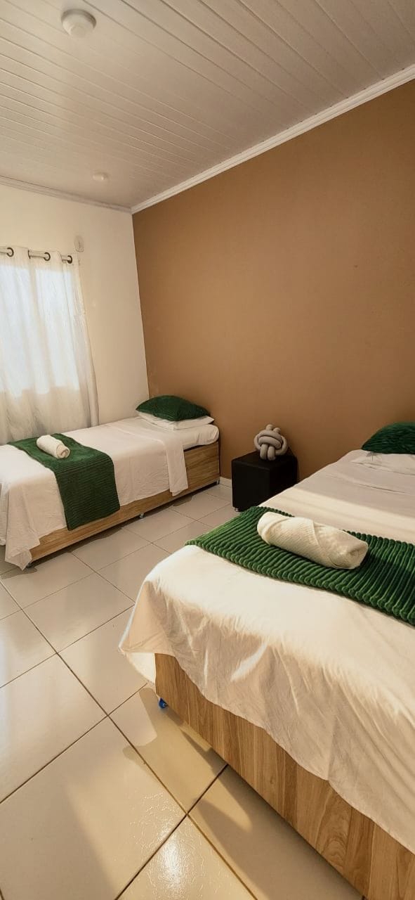 Todos os ar condicionados novos, todas as camas novas, localização central, próximo a supermercado, hospital, bares e restaurantes, uma suíte e mais dois quartos, um escritório de apoio, churrasqueira, maquina de lavar roupas, 3 banheiros, cozinha, sala de televisão, sala de jantar, garagem coberta para 3 carros