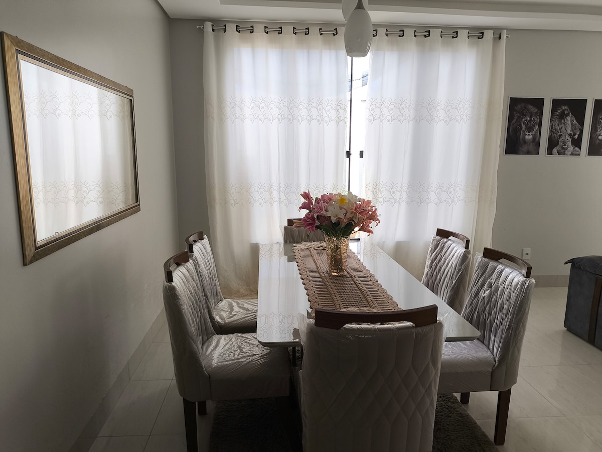 Relaxe com toda a família nesta acomodação tranquila. Quartos com ar condicionados Suite com Tv Banheiros com chuveiro ducha TV 58 polegadas, TV a cabo + 350 canais (netflix/youtube/spotify) Internet grátis Cozinha completa + microondas e airfryer 2 jogos de mesas para jantares Sofá cama Garegem para dois carros Portão eletrônico e cerca elétrica Lavanderia com tanque e varal Área Gourmet completa Câmeras de segurança na parte interna da garagem e externa da casa Acomodações Pet