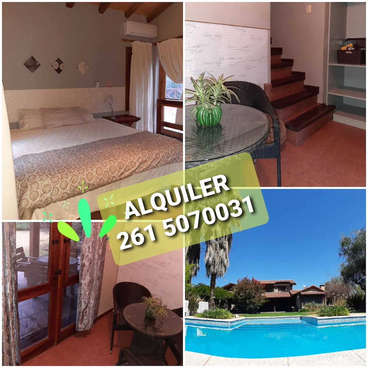 La casa se encuentra en una excelete ubicación en Chacras de Coria rodeada de un hermoso jardín con árboles y un añoso parral. Tiene una piscina de uso exclusivo para las visitas e ingreso independiente por garage. Cuenta con lugar para estacionar el auto. La ubicación es ideal para visitar bodega cercanas, salir a cenar por la zona o visitar Palmares Mall que queda a a 5 minutos en auto. Es una zona tranquila y el barrio cuenta con vigilancia durante la noche.