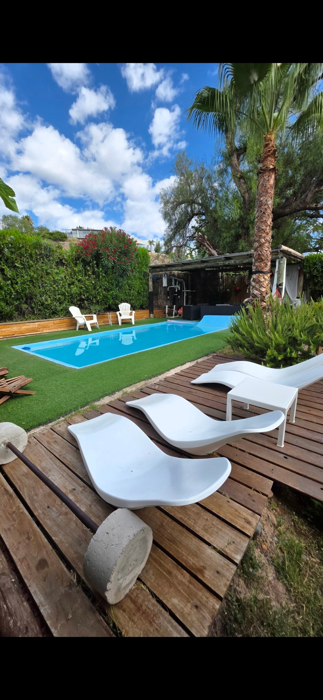 Relájate en un espacio único, donde se fusiona arte y naturaleza. La propiedad tiene 2600m², con jardín xerófilo y tradicional con mucha vegetación. Pileta privada con borde infinito, fogón y con un estanque con peces, nenúfares y fuentes. Es un lugar muy tranquilo sin vecinos muy cercanos. También habitan el espacio tres pavos reales, Noha. Lolo y Lola. Te invitamos a q conozcas nuestro paraíso.