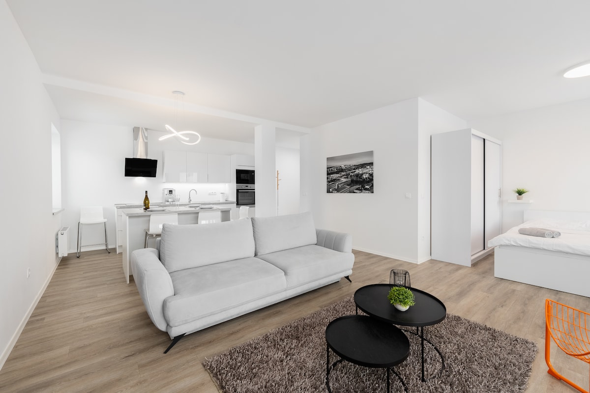 Welcome to our stylish, modern, and new apartment located in the heart of Zlin! Situated in the city center, everything is within walking distance, making it convenient for you to explore. Our disability-friendly accommodation features a balcony and is just a stone's throw away from the beautiful Zlin park. Book now for a delightful stay!