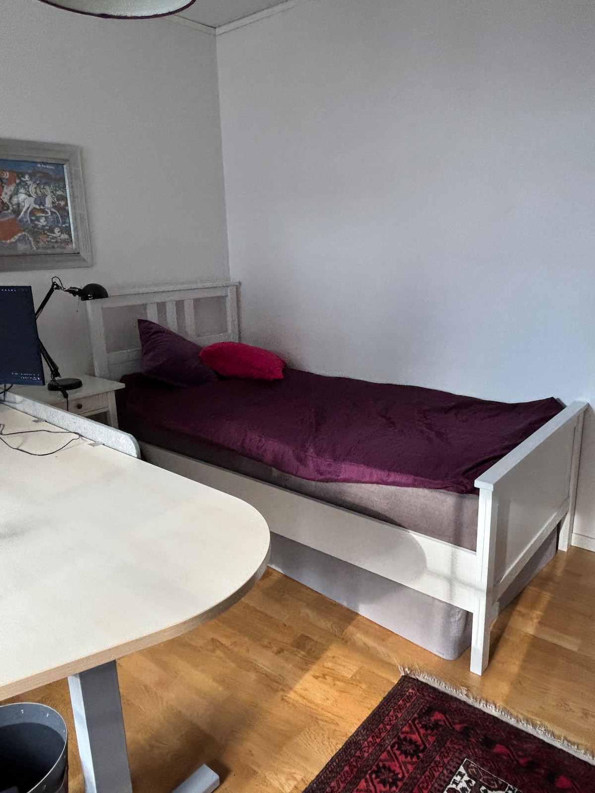Nyrenoverat gästhus ca 40m2 golvyta, med de flesta bekvämligheter i ett hem. Närhet till vatten med en liten strand som vintertid är ett populärt promenadstråk. Relativt centralt och nära till buss eller tåg. Gästhuset är beläget på samma tomt som Värdfamiljens bostad. Ca 5min promenad till gym och pizzeria. 10min cykelfärd till mataffär, ca 15-20min med cykel till stan. Parkeringsplats finns. Är ni fler än 2 personer finns ytterligare sovplatser att hyra mot avgift. Obs golvkallt vintertid