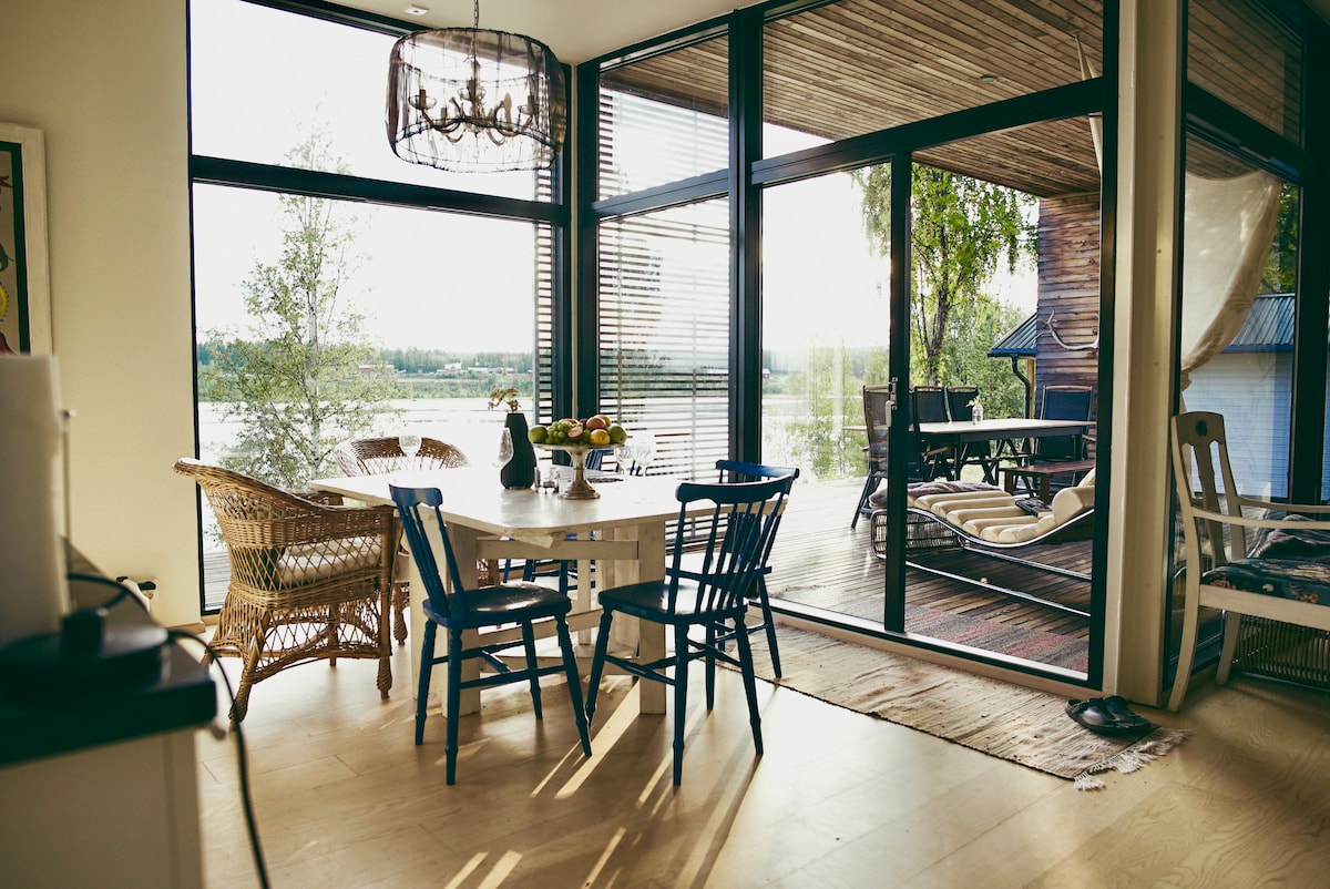 This is a comfortable modern house in the nature overlooking a beautiful calm river Luleälv. Panorama windows, large terrace with views and lots of light. Calm beautiful area less than 1 hour from higher mountains and 10 minutes in car for shops. Very private perfect for nature excursions, kayak, skiing, cross country or slalom or just relaxing in the middle of the nature and enjoying wildlife and nature. It´s a dream from children and safe, also perfect for well behaved dogs.