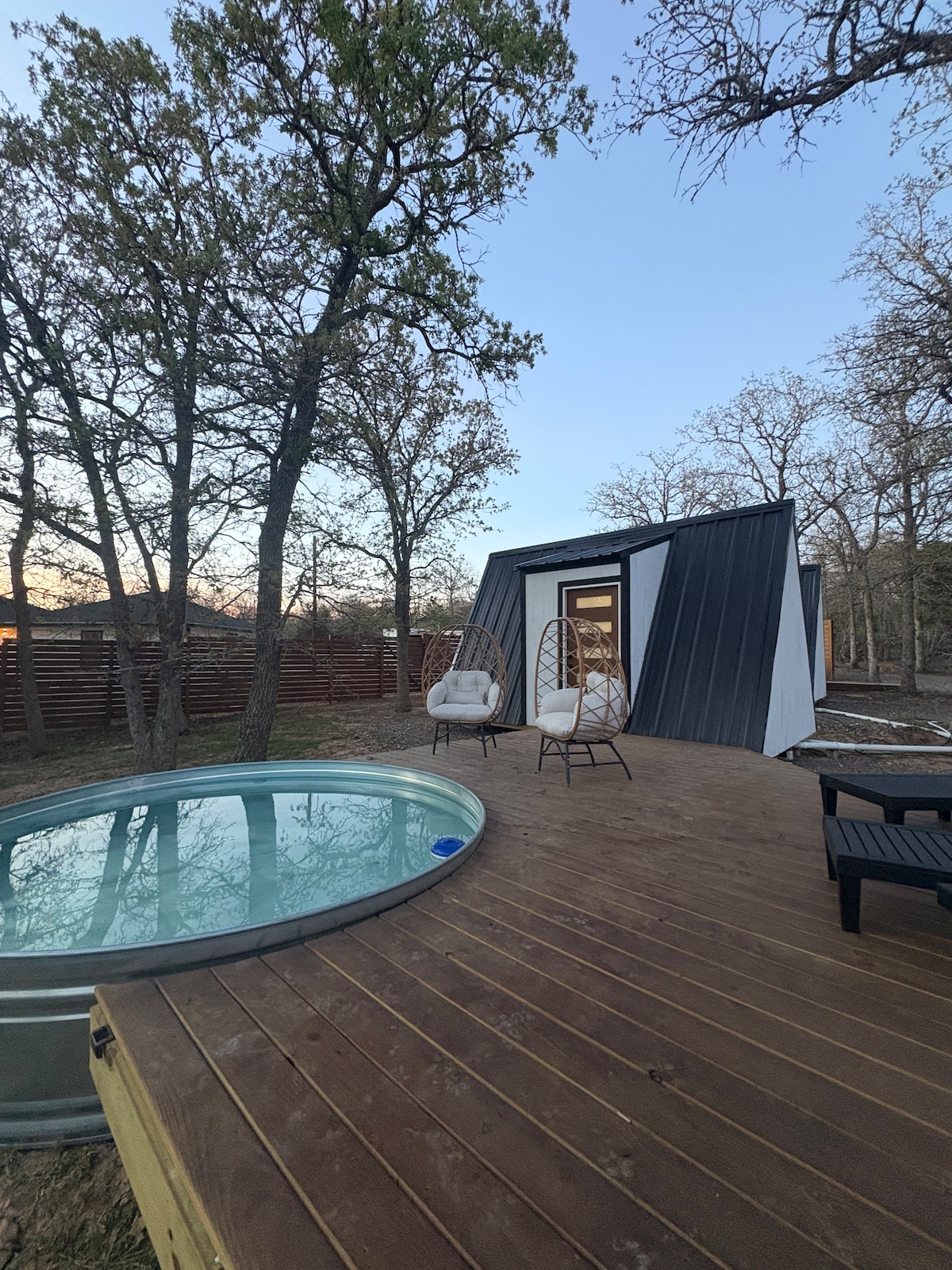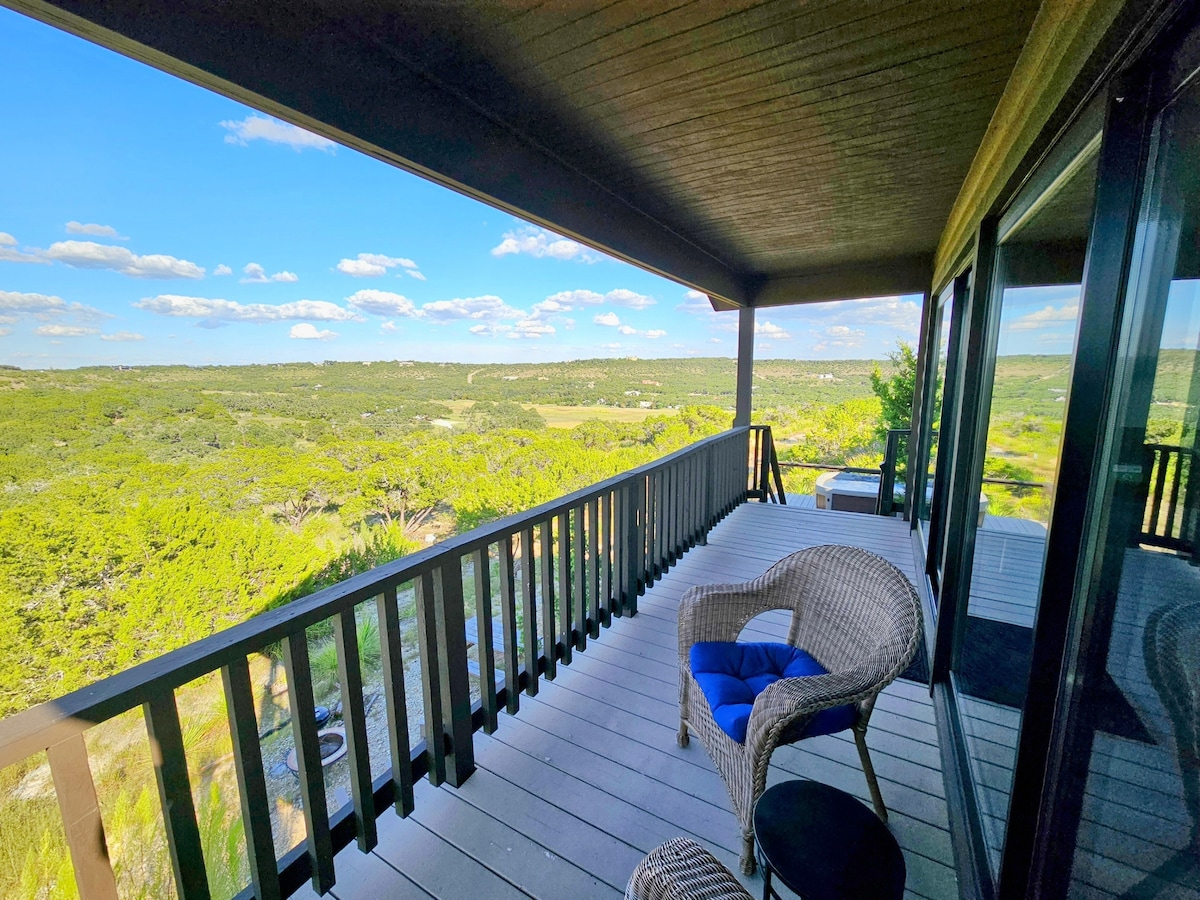 Perched high on a hill overlooking the gorgeous TX Hill Country sits the most stunning A-frame you ever did see. With a mix of mid-century style and artsy touches, this space is gorgeous. The cabin is tucked into a pocket of nature surrounded by 3 acres of oaks, elms, and junipers. The expansive front windows and raised deck provide and incredible sunset view across the hills and dark sky lighting sets the stage for breathtaking starry skies. The hot tub and outdoor shower is icing on the cake!