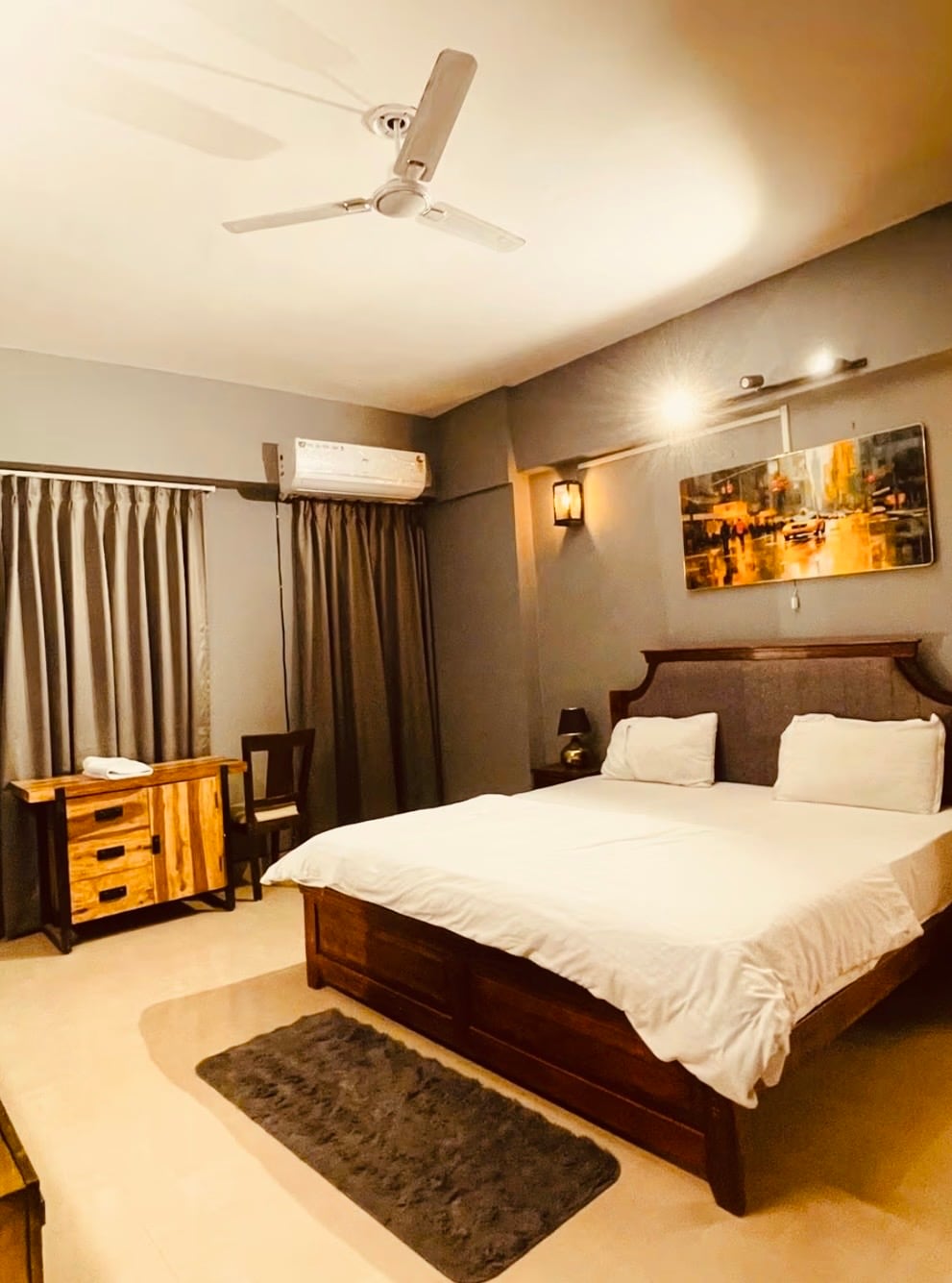 Our one bedroom suite consists of a large bedroom and a separate living room. The bedroom is connected with a washroom and a large balcony. Our living room is connected with an open kitchen, the kitchen is fully equipped with all the amenities such as microwave, gas Stove, refrigerator and all the Utensils and glasses, we also have a mini bar on our kitchen wall. The living room also has a 4 seating dining table. The is a sofa which turns into a queen size comfortable bed for extra guests.