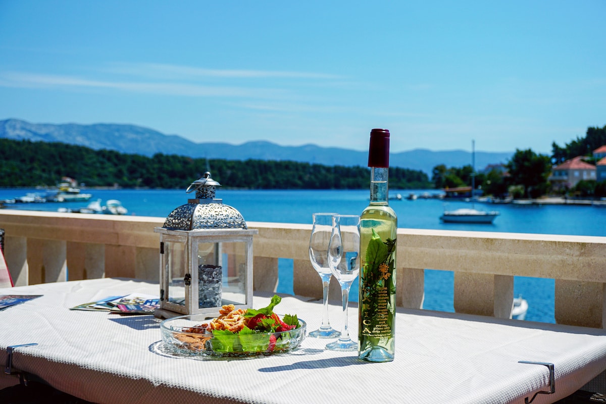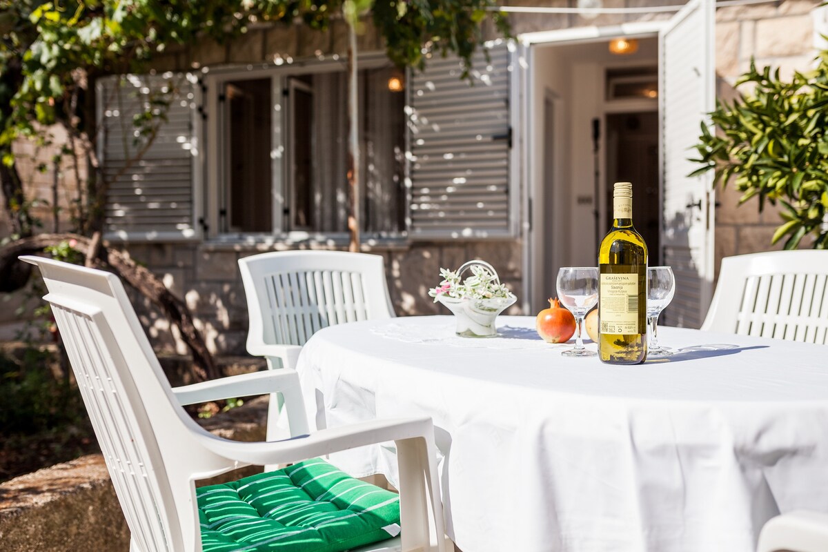 The house is located in a quiet part of Korcula, on the road to Lumbarda. The house has two apartments for rent. In our apartments we also serve breakfast. We always try to prepare food for breakfast that is produced on our farm, and that is organically grown, or organically grown food that is produced by methods complying with the standards of organic farming, from local producers. Breakfast is not included in price.