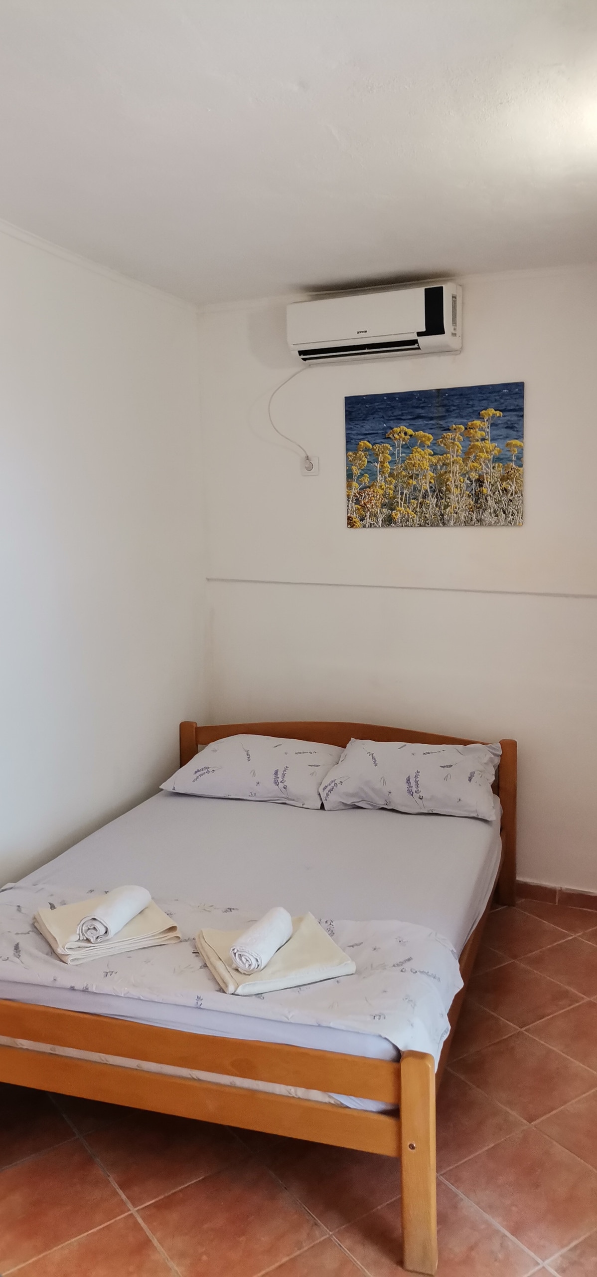 Apartment has 2 bedrooms with big stone beds (200x200), 1 bathroom, living room, kitchen and 2 terraces. It has also free wifi for all guests, swimming pool, parking space, air-conditioning... Swimming pool, barbecue and backyard are shared with guests from other 2 apartments. Pets are welcome.
