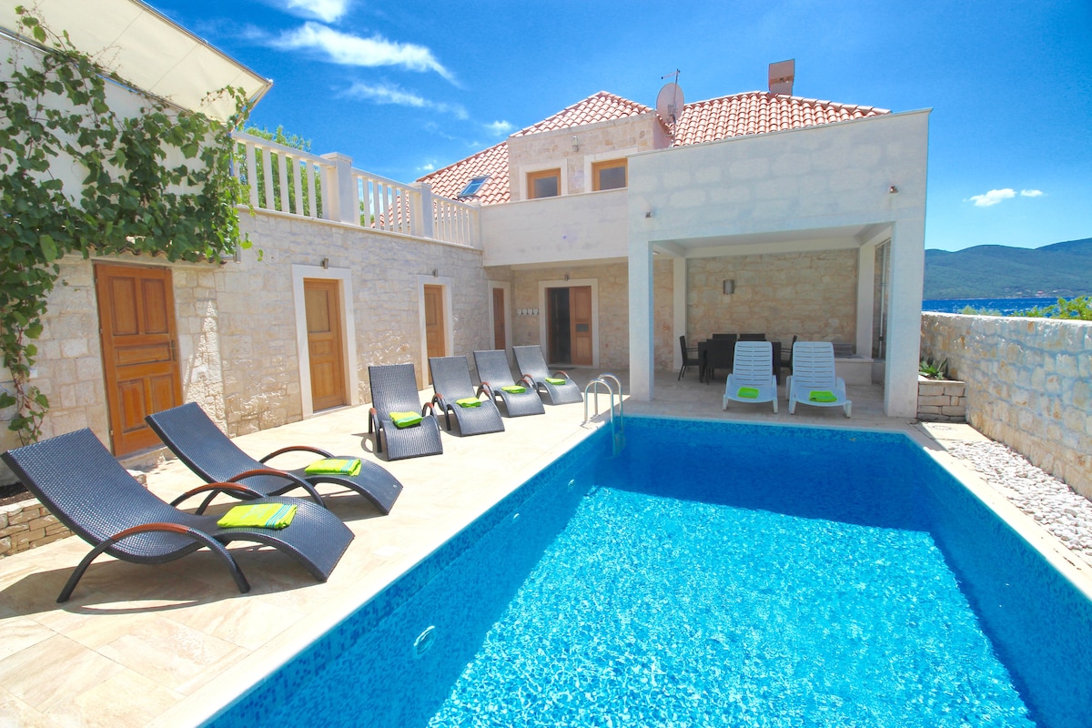 Piccolo Paradiso SOUTH is a NEWLY BUILT Sea Front Villa with a Private Pool. ★★★★ It is one of 3 holiday homes (Piccolo Paradiso SOUTH-WEST, SOUTH and SOUTH-EAST) on the south side of the island Korčula. Surrounded by Mediterranean greenery and blessed with a spectacular view, each house is designed to make the best of outdoor living with a private spacious terrace, barbeque and pool, only 70 meters away from the sea. Stairs to the sea provide access to a small rocky semiprivate beach.