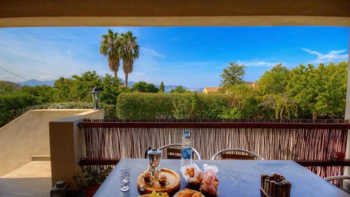 Très belle villa sur grand terrain familial avec vue panoramique sur la mer. Superficie de 75 m2 entièrement refaite à neuf et ameublement neuf (cuisine équipée,machine nespresso) Maison indépendante dans un quartier très calme et prisé à - de 1 km du centre ville et de la citadelle. A partir du chemin des douaniers situé en contrebas de la villa vous aurez accès à la crique et pourrez faire une belle promenade jusqu'au phare de la Revellata Parking gratuit Grande terrasse face à la mer.