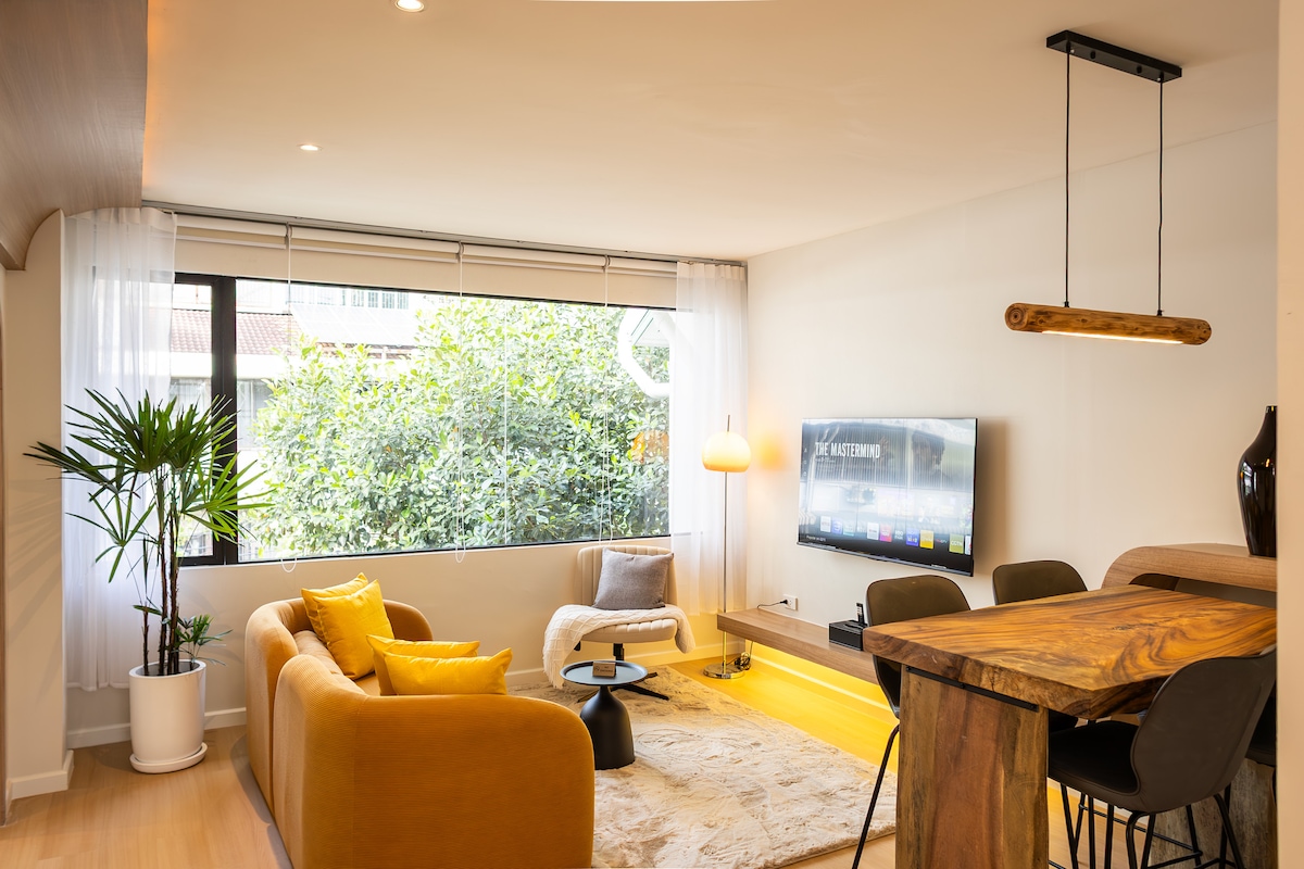 Welcome to our cozy high-ceiling apartment on the 27th floor of Edge Sukhumvit 23. It’s just steps from BTS Asok and MRT Sukhumvit. The living room is bright with full-height windows, while the loft-style bedroom gives you both an upstairs sleeping space and a downstairs work area with an extra bed. Best of all, the pool and gym are right on the same floor, making it easy to relax and stay active during your stay.