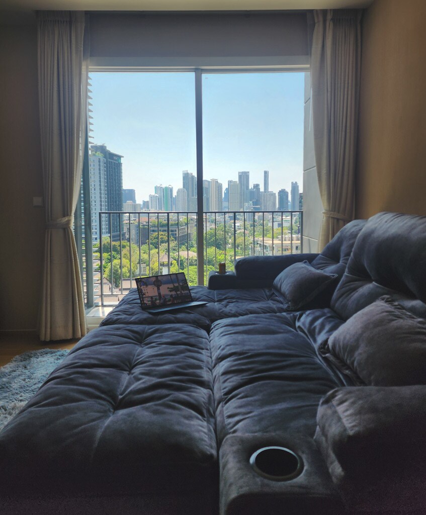 Genieße eine geräumige, frisch renovierte 2 Zimmer-Wohnung im Herzen von Sukhumvit – ganz für dich allein – nur wenige Gehminuten von BTS Nana, BTS Asok und MRT Sukhumvit entfernt. Mit: Pool, Fitness, Balkon mit toller Aussicht, Queen-Size-Bett, 55"-Smart-TV, Klima, 300er WLAN, elektrisches Türschloss, Safe, voll ausgestattete Küche und Regendusche. Umgeben von Terminal 21, Streetfood, 7-Eleven, Cafés und Massagestudios. Perfekt für Langzeitaufenthalte, digitale Nomaden und Geschäftsreisende.