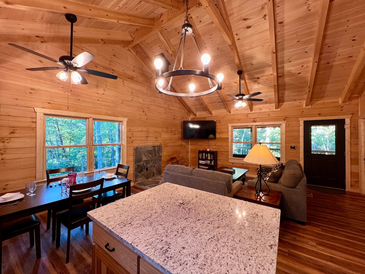 Trahlyta is a modern cabin on 6 wooded acres in Dahlonega. It is adapted/wheelchair accessible ♿️ and pet-friendly. Your getaway awaits! Trahlyta is only... - 5-10 min from wedding/event venues -10 min from the historic square -10-15 min from wineries/breweries -10 minutes from the Appalachian Trail -1 mile from the 3/6 Gap Route 850 sq ft, 2 bedrooms, 2 bathrooms, an open living area, a stocked kitchen, and plenty of outdoor space- including outdoor tv/fire pit! Follow us @trahlyta_cabin