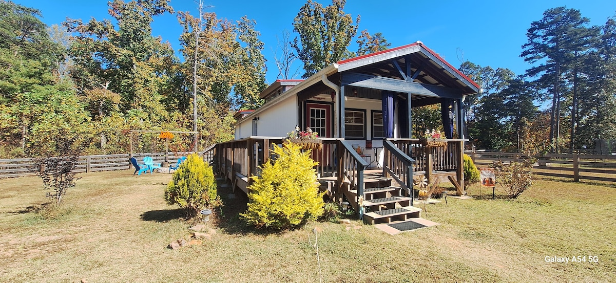 Try out Tiny House living in the North Georgia woods less than 10 minutes from the Dahlonega town square. Picture a 300 SF hotel suite plus 50 SF screened porch & a 150 SF wood deck on 2 heavily wooded acres 100 feet+ from neighbor. The house may be tiny but the fixtures are full sized including a "normal house" tub & toilet. The queen sized bed, kitchen & bathroom vanities, barn door to bathroom & shower enclosure were all custom designed & built by the owner. Short Term Rental License #141