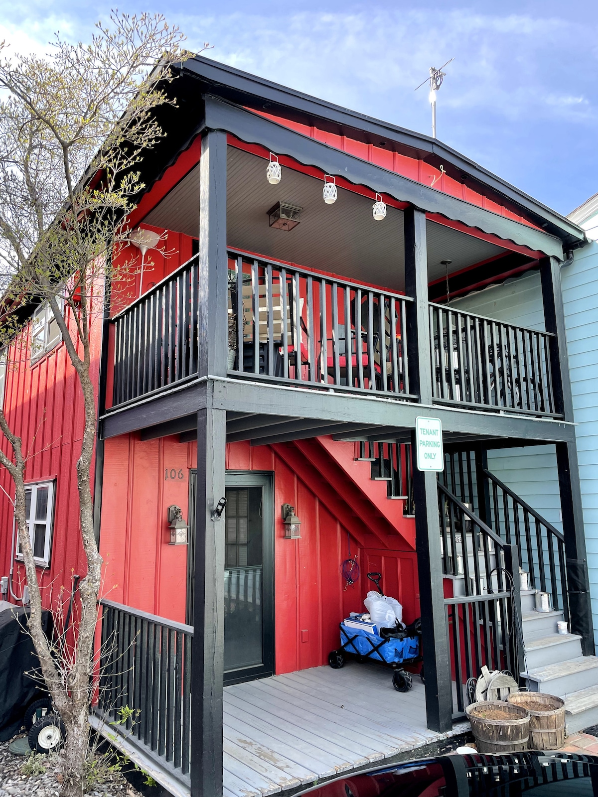 Green Sanctuary is the second floor apartment B in a two unit apartment building. It is a bright cheerful one bedroom unit with a large covered balcony located on the grounds of the famous Egyptian house. The apartment is comfortable for 2 people but will accommodate 4 with the living room couch converting to a bed. The property is conveniently located with plenty of off street parking.