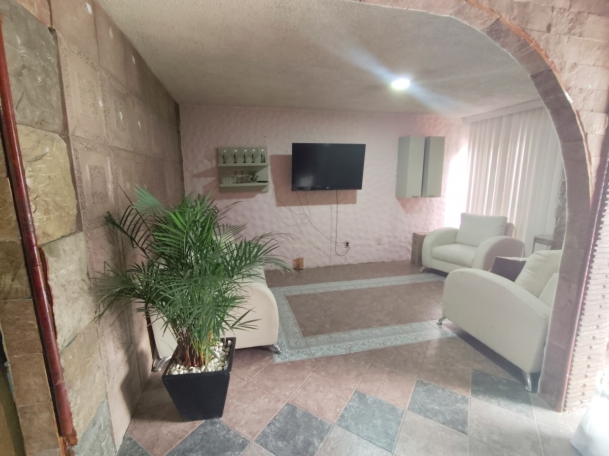 Hermosa casa de campo con amplio jardín privado, ideal espacio de esparcimiento y relajación para pasar unos días en compañía de tus seres queridos. Ven a disfrutar del bienestar y la tranquilidad que te ofrece la naturaleza. Ideal para ejecutivos, convivir en familia, pareja, realizar una cena, o arreglar a una quinceañera o novia, después de un plácido descanso. Jardín con bonita iluminación. Internet de fibra óptica, net flix, max, you tube premium en una TV Puedo facturar tu estancia.