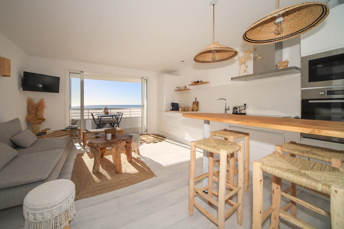 Bel appartement situé sur la rive droite de Palavas, en première ligne vue sur mer, et proche de toutes les commodités dans une résidence très calme. De plus, vous disposez d'un parking privé et sécurisé. Appartement de 31 m² refait à neuf, traversant, salle de bain, toilette indépendant, lit superposé à l'entrée pour les enfants, 1 canapé convertible couchage quotidien en 160 x 200 cm. Cuisine équipée. Vous disposez dans l'appartement d'une télévision grand écran et du WIFI.
