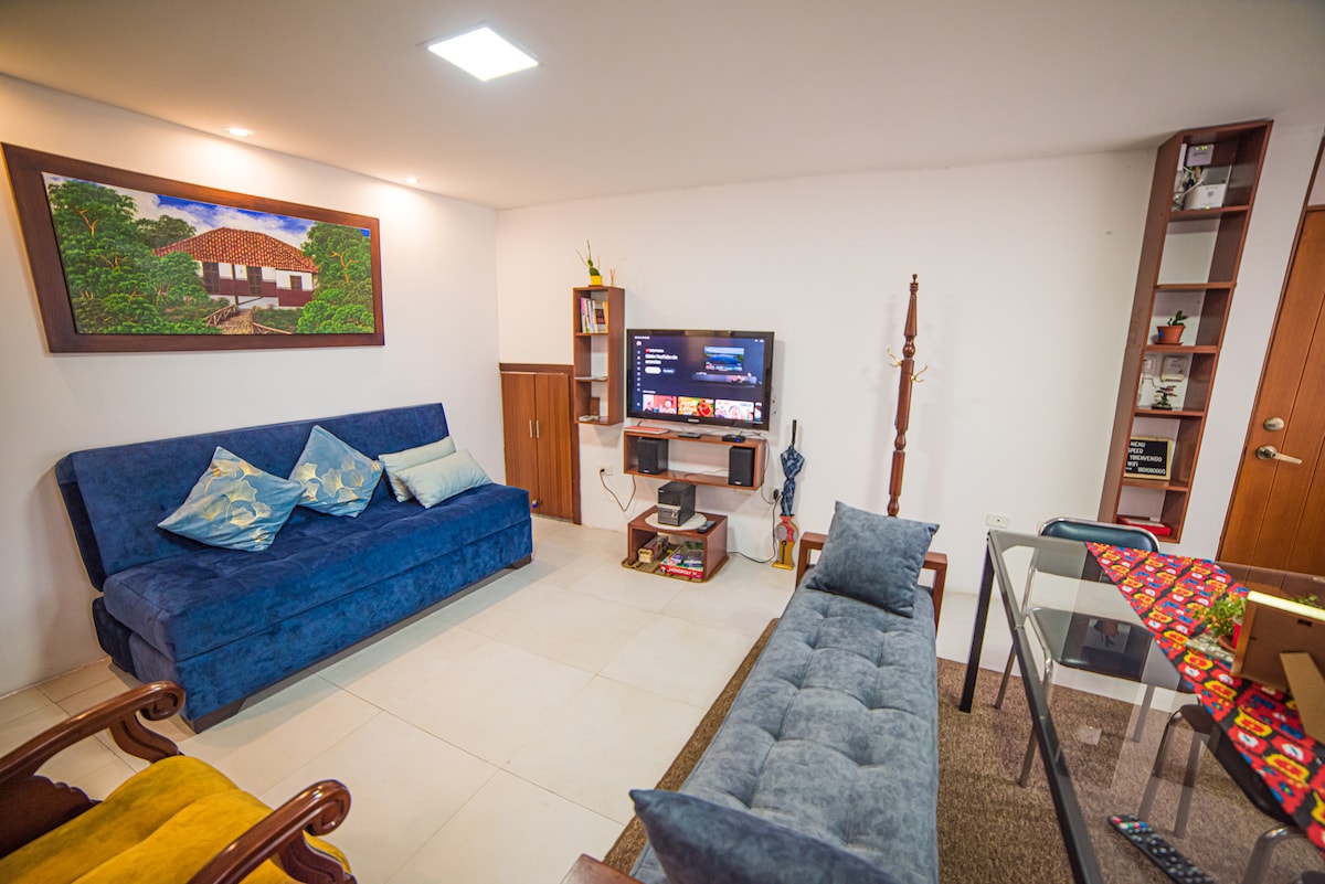 Departamento ubicado en el centro de Baños en una zona tranquila y confortable con una preciosa vista hacia las montañas cuenta con una habitación matrimonial y un sofá cama de 2 plazas súper cómodo ya q se convierte en una cama completamente con la mismas altura de una cama normal Contamos con utensilios de cocina mini nevera microondas licuadora cafetera ,tostadora , wifi, televisión También si deseas venir con más familia tenemos otro departamento a lado con las misma características