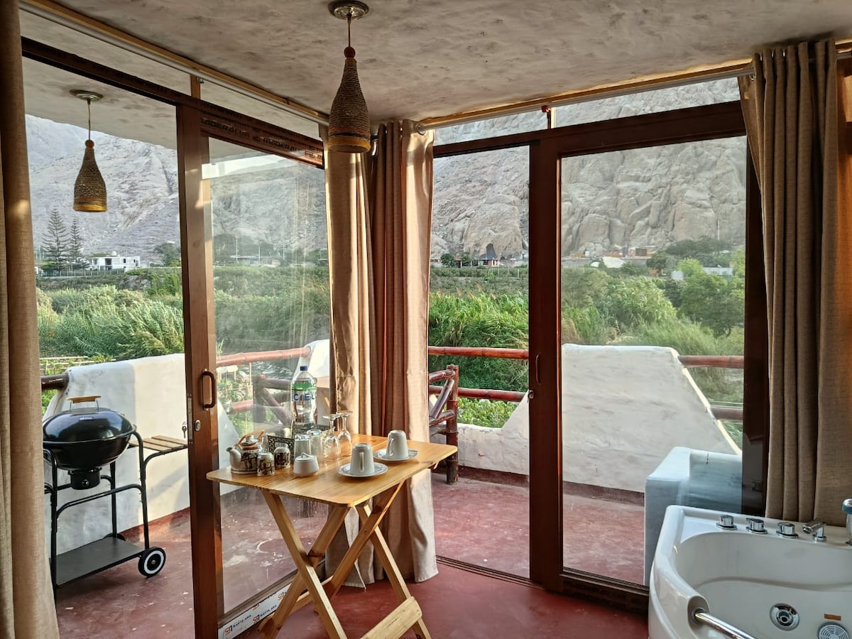 Bonita habitación para pareja, ubicada en el cálido valle de Calango, a 1 hora y media de la ciudad de Lima. - Para 2 personas. - Cama king (3 plazas). - Baño privado. - Mesa + 2 sillas. - Balcón Además en las áreas compartidas: - estacionamiento privado. - zona de parrilla. - Zona de fogata. - Zona de wifi. - Piscina para niños y adultos. - áreas verdes - Restaurante - juegos de fulbito y sapo. Horario: Check-in es a partir de las 3 pm y el check-out hasta las 1 pm