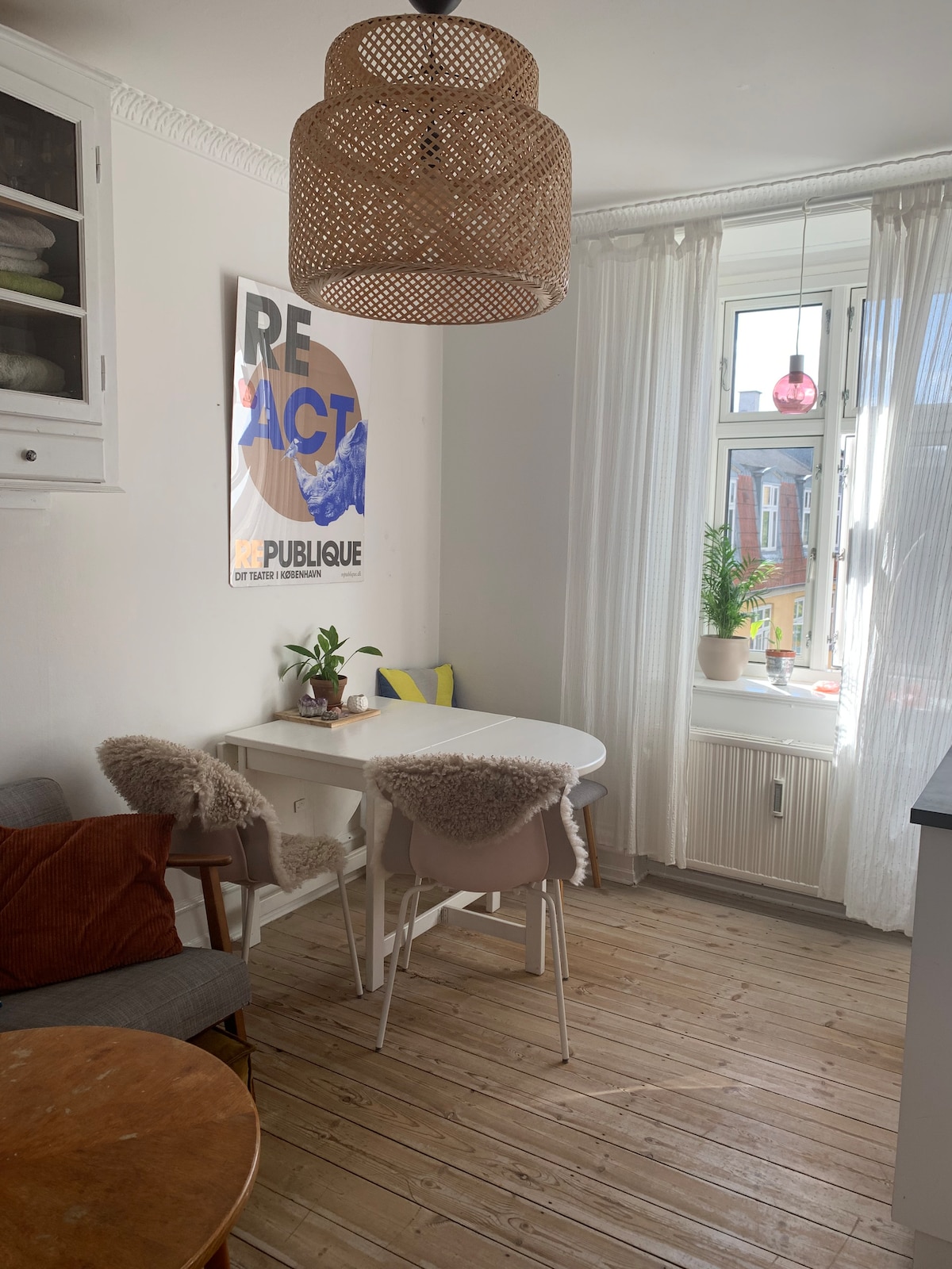 The apartment is located in inner Copenhagen in the middle of the vibrant shopping district. The apartment is facing a courtyard, but you can still hear the rich citylife in the background. The neighboorhood is filled with cafées, bars and shopping opportunities. The famous street "Strøget" is an arms length from the apartment, and runs through the entire midtown. The apartment is perfect for a couple, but it is also good for a Family or 3 or 4 friends or Mom, Dad and 2 kids.