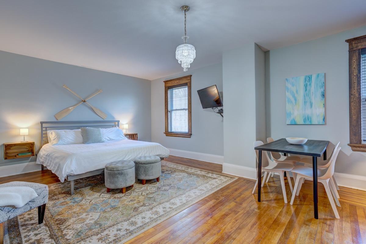 THE ROSEBAY AT B2 LOFTS is located in a newly renovated historic 1800s building adjacent to the Lunenburg Harbour in the heart of the UNESCO World District. Designed by internationally celebrated Brian MacKay-Lyons this charming 1-bedroom apartment is located on ground level, is wheelchair accessible and has a sprinkler system. The great room features: 13.5' ceiling, Belgian wood stove, huge glarage door that opens to breathtaking views of the Lunenburg Harbour, and a pull-out sofa bed.