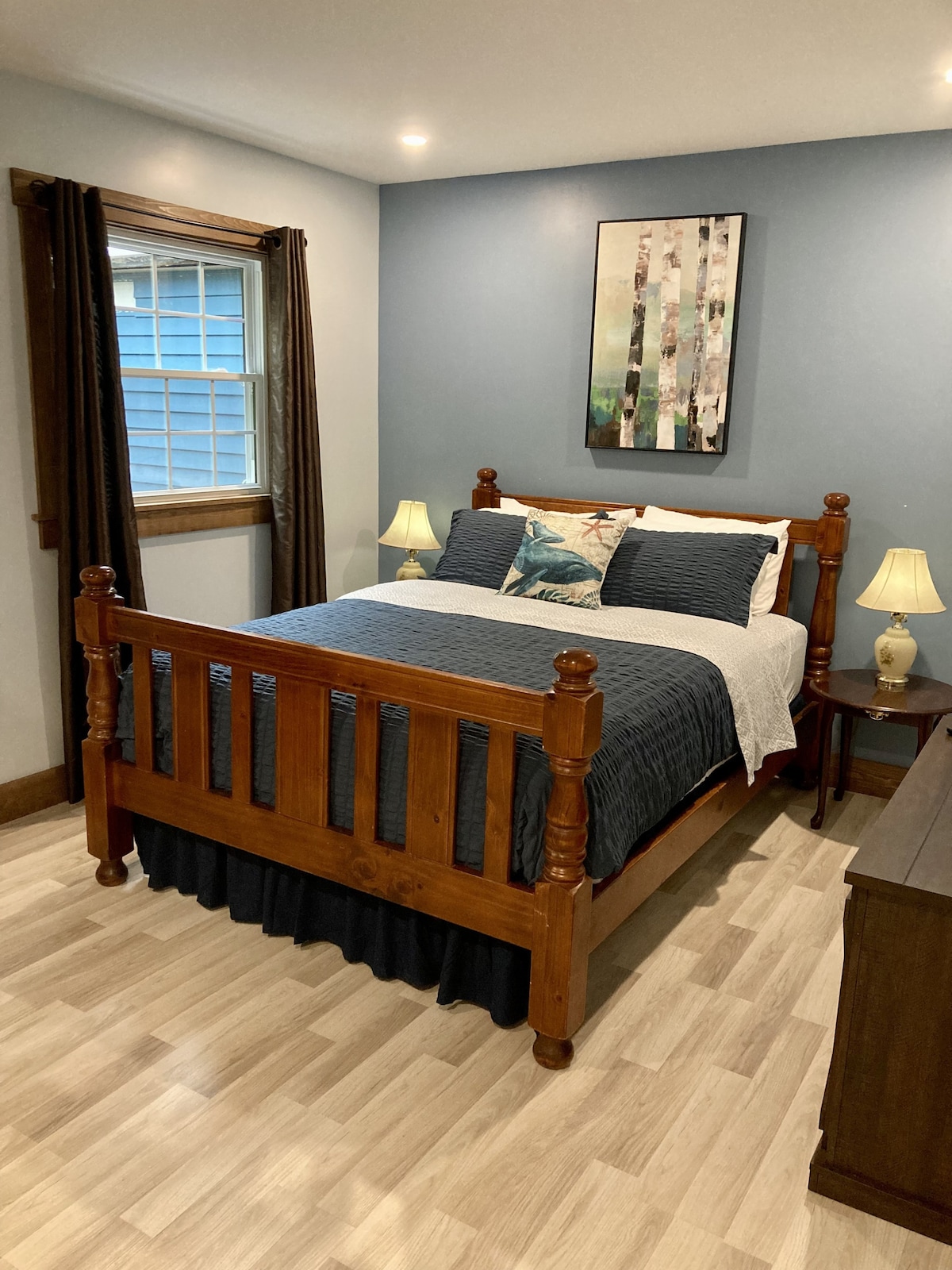 The Thomas is a two-bedroom suite on the top floor of our B&B. Both bedrooms have queen beds and closet space, and the master bedroom has access to a private balcony overlooking Lake Thomas. Balcony is west-facing and has a perfect view of sunsets over the lake. The suite also has a private seating area with futon and bar fridge, as well as a large bathroom with a jacuzzi soaker tub and separate shower.