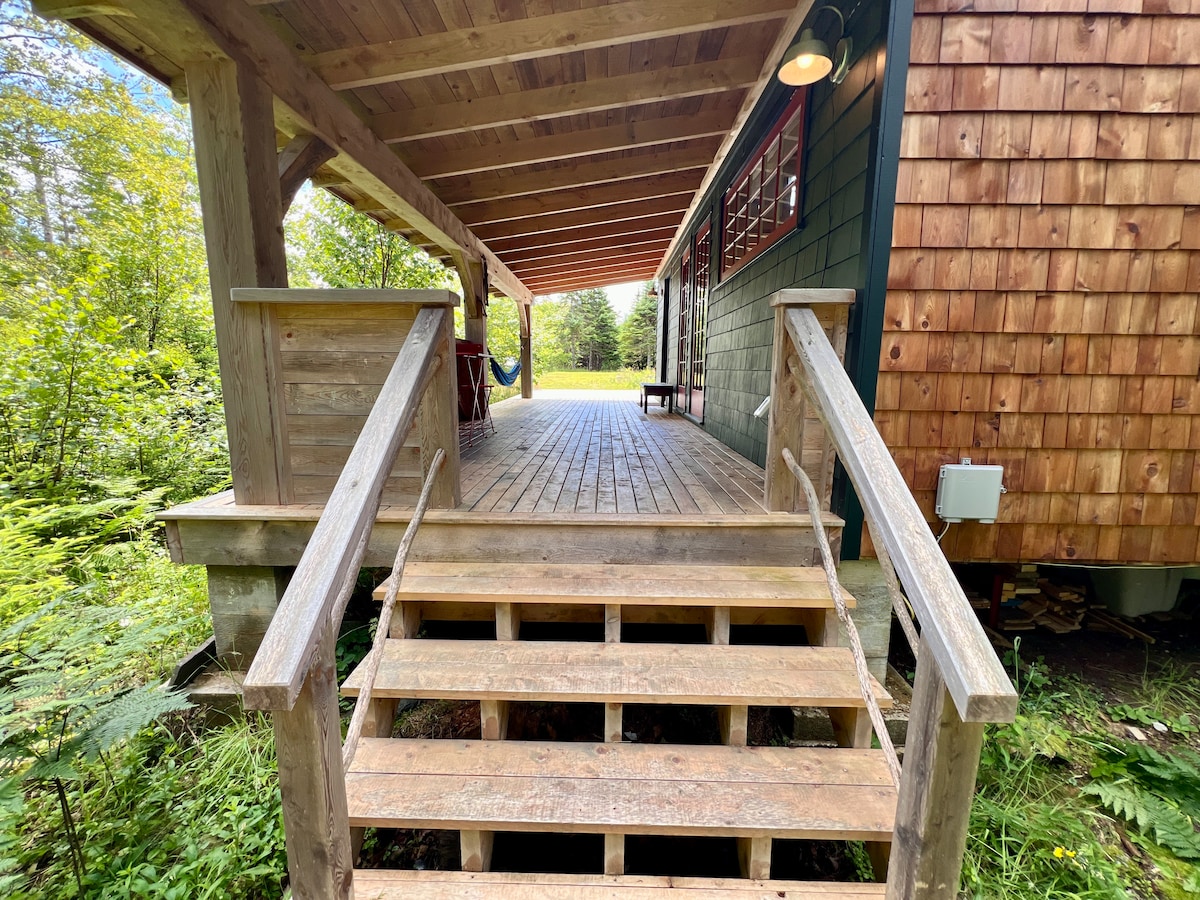 Come for a tranquil, secluded getaway in our handcrafted cabin near the end of a remote Nova Scotian peninsula that feels wonderfully your own. Enjoy morning lattes on the timber-frame porch, beachcomb and surf at the nearby beach, bike to the local wharf, unwind with a wood-fired sauna and cold plunges in the creek, write songs or poems on the piano or typewriter, get creative in the converted school bus studio, or simply sit by the wood stove with a good book or a tasty drink.