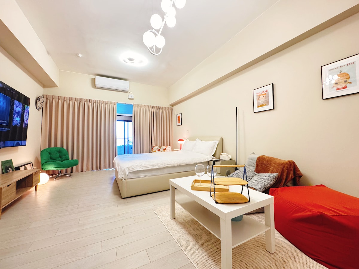 [平日回饋中]高樓海景附浴缸.巨臥榻.室內車位.泳池.單車.65吋4K電視15坪大房 .鄰海300米