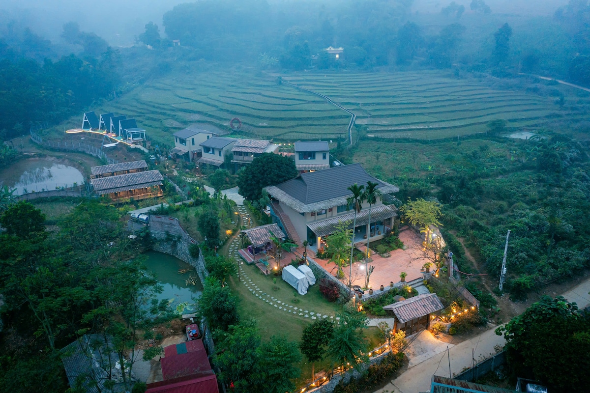 Thư giãn cùng cả gia đình tại nơi ở yên bình này. - Diện tích khuôn viên rộng rãi 2.800m², bao gồm 1 phòng khách, WC, 2 phòng ngủ và 2 glamping tiện nghi với điều hòa nằm sát hồ. - Tiêu chuẩn dành cho 16 người, miễn phí cho trẻ dưới 6 tuổi, tối đa cho đoàn 20 người. - Có 3 sân vui chơi teambuilding. - Trang bị bàn bi-lắc, bể bơi, thuyền kayak, vườn rau xanh mát, trải nghiệm trà chiều và máy chiếu ngoài trời.
