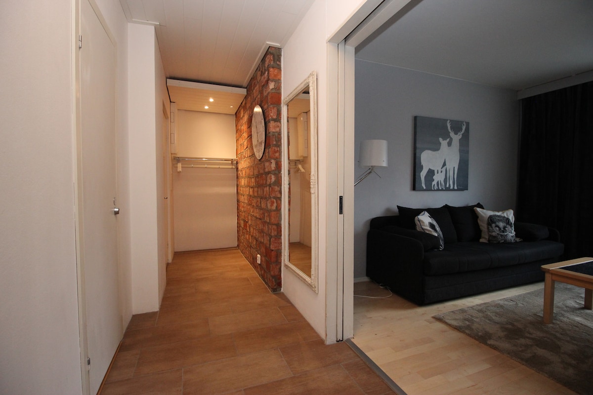 Enjoy a relaxing stay in this cozy two-room apartment with private sauna, just minutes from the city center yet in a quiet area. Sleep well in the flexible bedroom (double or two singles) and use the sofa bed for extra guests. The home is fully equipped with modern comforts: dishwasher, washing machine, dryer, microwave, coffee/water kettles, toaster and free WiFi. Warm floors, sauna and key box add convenience. Private parking space with heating outlet right next to the apartment is included.