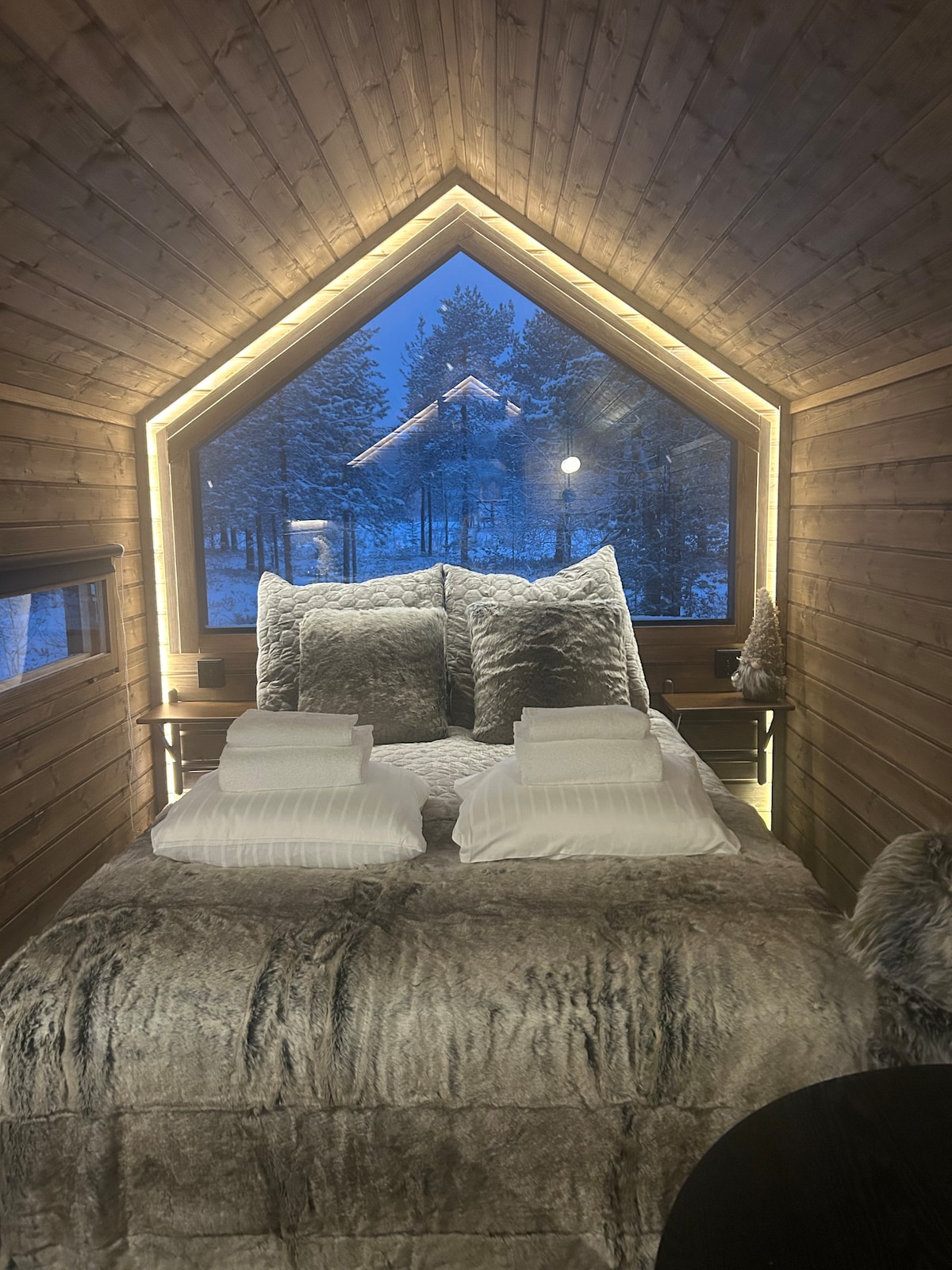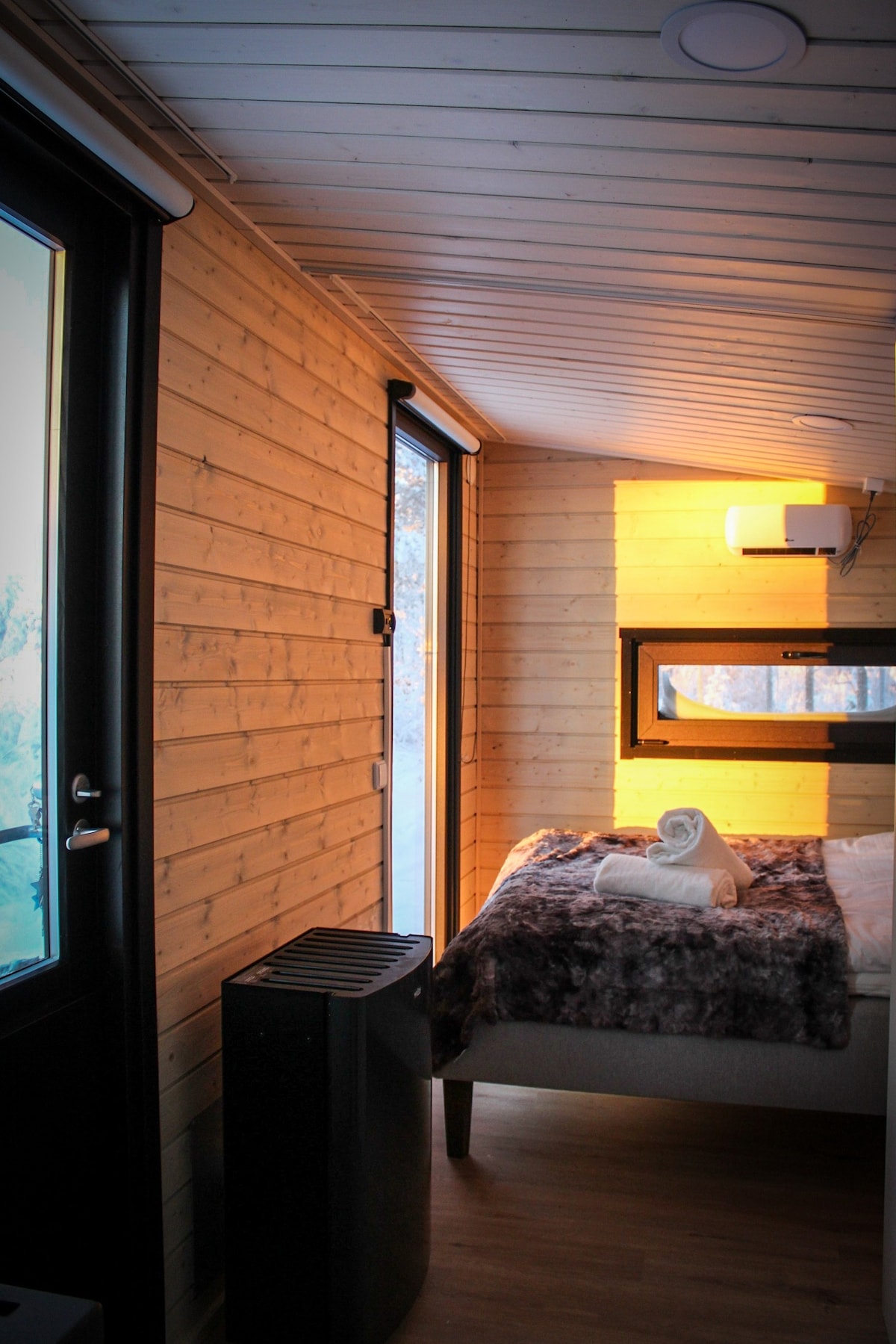 Stay at Lapland Glow Hotel in Rovaniemi and enjoy the Arctic atmosphere. Panoramic windows give you the chance to see the Northern Lights right from your room. If the sky stays quiet, our unique Glow ceiling brings the northern night indoors with a soft, calming light. Cozy rooms, private bathroom and breakfast included. Close to nature, yet just a short drive from the city and Santa Claus Village. Welcome!