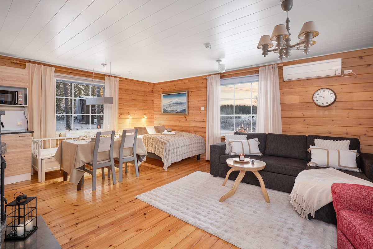 New premium cabin (2025) for two – hotel comfort in the heart of Pyhä. Enjoy peace and Lapland’s nature with ski, hiking and biking trails starting from the doorstep. ✔️ Included: final cleaning, made-up hotel-quality bed linen, towels, coffee & tea, plus toiletries (shampoo, conditioner, soap). No hidden fees. ✔️ Large windows for Northern Lights views. ✔️ Fully equipped kitchen. ✔️ In winter: sleds + shared grill hut. 📍We have 5 cabins – if this one’s booked, kindly check our other cabins.