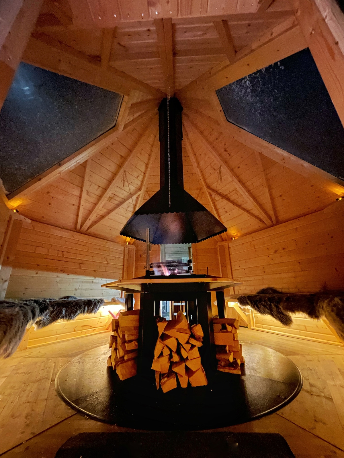 Our igloos are 32m² in size and can accommodate two to four persons. The motorized double bed is directly under the glass ceiling. Separate extra beds are made from the sofa. All igloos are equipped with a toilet and a shower, a TV, a drying cabinet for outdoor clothing. All rooms have a well-equipped kitchenette with a fridge, cooking hobs, dinnerware and cutlery, a kettle, a coffee maker, a microwave oven and a dishwasher.