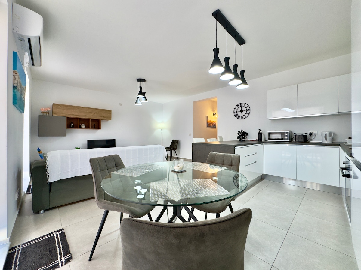 Strategically located between the two Marsaskala bay inlets, the apartment is only a 5 minute walk from the sea promenade, restaurants, shops, and bus station and a 10 minute walk to the swimming areas and beaches in St Thomas Bay. The apartment features 2 bedrooms, 2 bathrooms, a combined kitchen and living area, sunny terrace, A/C, Wi-Fi, Netflix TV & laundry room. Light breakfast items are also included. A garage across the street is also available free of charge for private parking.