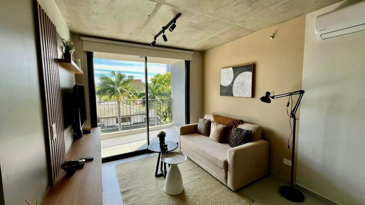 Stylish Studio in Villa Morra Modern studio in a new building, steps from Villa Morra & Mariscal López Shopping, Food Park, grocery stores, top bars & restaurants Perfect for couples or business travelers. Includes AC, washer/dryer (rare!), microwave, hot/cold water filter, coffee maker, blender, fast Wi-Fi, smart TV, cable, work desk, and spacious balcony Access to rooftop, pool & gym. Early check in and late check out available for $25 (if possible) All guests must be registered on the Airbnb