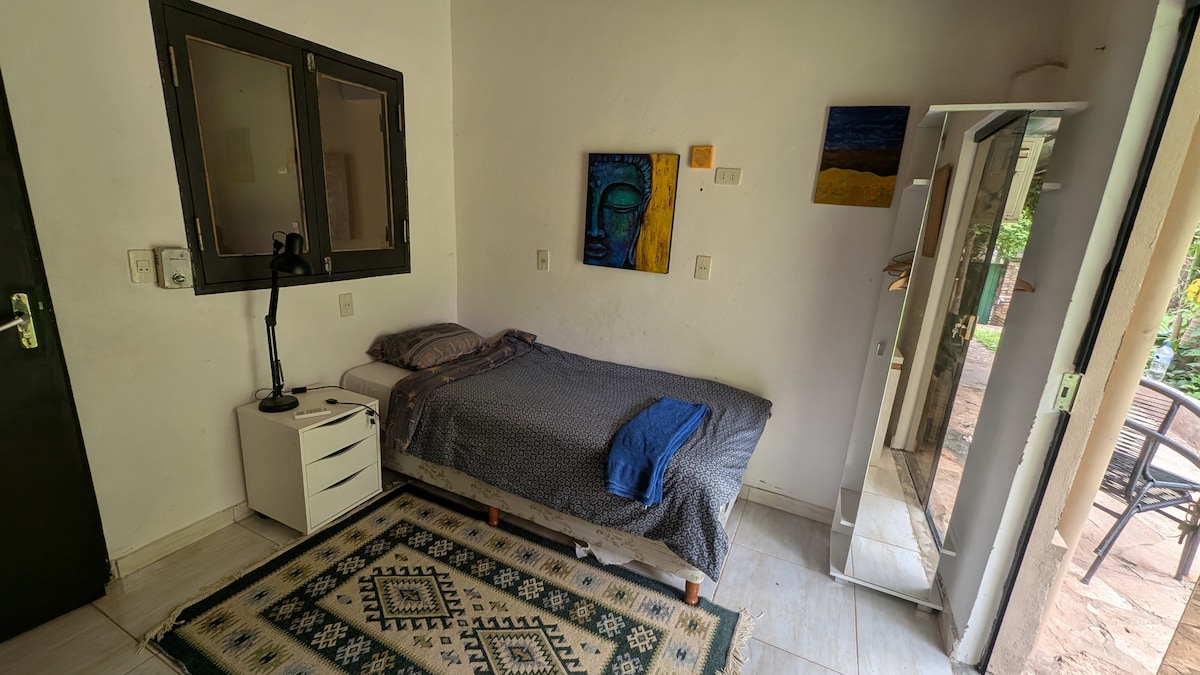 Alójate en un espacio acogedor en el corazón de Asunción, a pasos de la Avda. San Rafael, con fácil acceso a transporte y servicios. Pieza totalmente equipada: - Cama matrimonial con amplio guardaropa - Baño privado - Comedor - Cocina equipada (anafe, microondas, hervidor, vajilla, heladera) - Estacionamiento privado - Jardín con mesas y sillas para descansar o desayunar. - Ubicación estratégica a minutos de shoopings y atractivos locales en una zona muy segura y tranquila de Asunción.