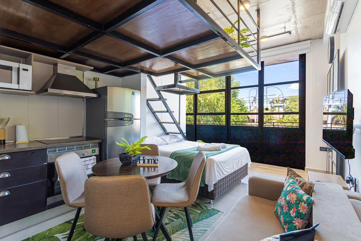 Modern and comfortable apartment with incredible views of the city. It combines design, functionality, and quality. It features a queen bed, air conditioning, desk, Smart TVs with international channels and an entertainment library, sofa bed, fully equipped kitchen, and a balcony. Common areas include laundry, pool, gym, spa, sauna, jacuzzi, and 1 covered parking space. Ideal for business trips or couples. Strategically located close to everything. Comfort, stylish, and practicality all in one.