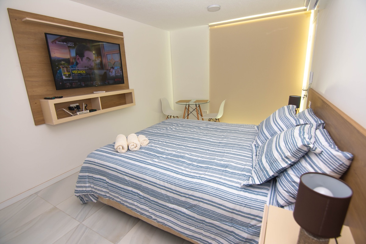 "La felicidad es disfrutar las pequeñas cosas de la vida". Comparte las mejoras cosas de la vida en familia o con tus amigos en este magnifico departamento con muchas comodidades. Tiene lo necesario y suficiente para pasar ese momento que tanto has soñado, una habitación con cama queen , hermoso televisor de 50 " con potente wi-fi , un baño, mueble de comedor y cocina equipada. Pero además puedes disfrutar de todos los amenities que están incluidos por el precio de este alquiler.