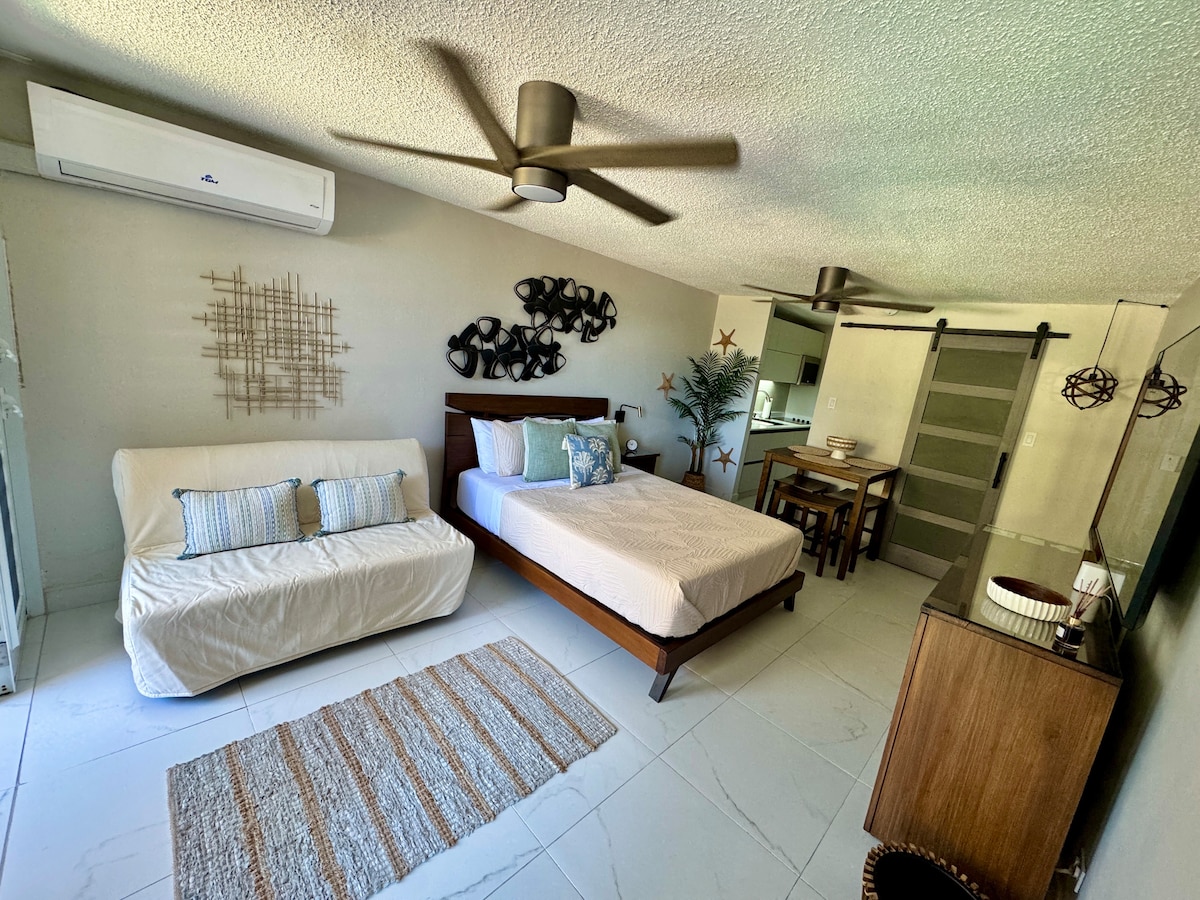 You’ll love this modern beach condo just steps from the best beach in Puerto Rico. Comfortable furniture, air conditioning in every room, high speed WiFi with mesh system, big screen Smart TVs, two balconies, laundry, kitchen, filtered water & free Puerto Rican Coffee. Luquillo is a relaxing friendly beach community with great restaurants & bars within walking distance. You can enjoy surfing, paddle boarding and Jet Skis. Two minutes to Casino & Kioskos with restaurants, shops and sports bars.