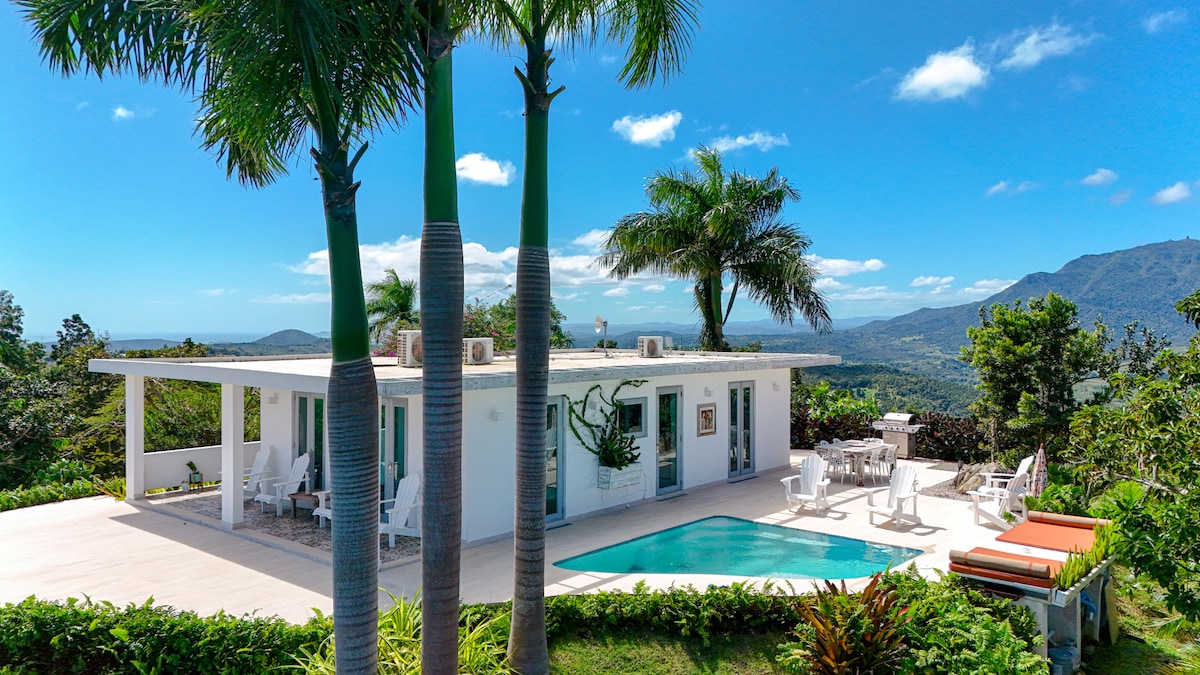 Nestled atop a lush hill at the beachfront town of Ceiba, this 2-bedroom house is a haven of luxury & tranquility, offering a spectacular panoramic view of the ocean, the rainforest, mountains & neighboring islands. As you approach the property, a winding driveway bordered by vibrant, blooming flowers leads you to the entrance, setting the tone for the enchanting retreat that awaits. Just a 1-hour drive from SJU's International Airport & half hour ride from El Yunque National Rainforest.