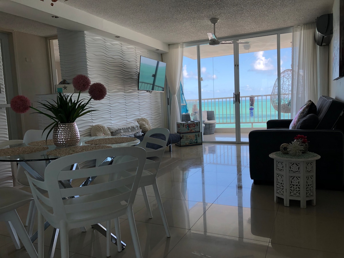 Cozy corner apartment located at the 12th floor at the beautiful coastal town of Luquillo. Exclusive bedroom completely overlooking the ocean with a private balcony for a truly oceanfront experience. Breathtaking ocean and city view’s in all areas of the apartment. Fully equipped apartment with private beach access gate. Scenic walkable destination with restaurants, bar’s, live music, coffee shops and more. Centric to tourists destinations like Culebra & Vieques port, Bio Bay and El Yunque.