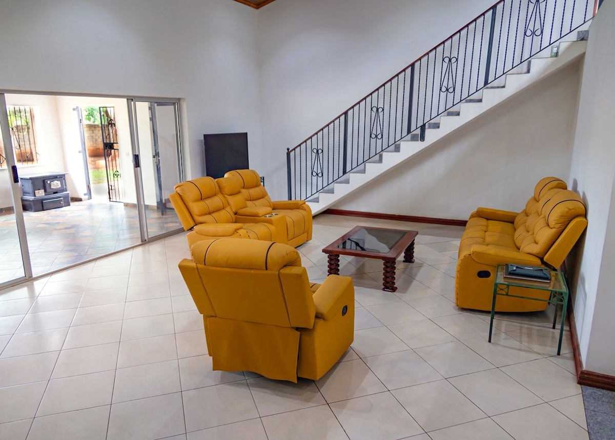 This stylish place is perfect for family or group trips. Within 3.5km radius from Eastpark, Arcades and Mandahill Malls, Mulungushi Int. Conf. Centre and the new CBD, making it ideal for a weekend getaway or business trip; only 25 minutes to the airport. The inside a spacious, comfortable open concept living area with the dining & fully equipped kitchen overlooking the verandah and garden. Beautiful pockets of well manicured shared garden space.