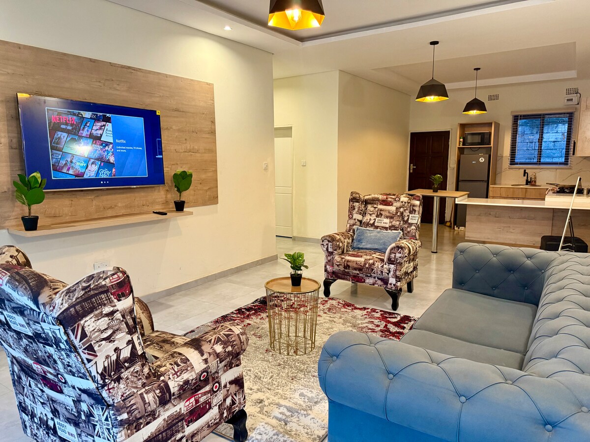 Forget your worries in this spacious and serene one-bedroom retreat. The One by Tefa offers solar power, fast Wi-Fi, a smart TV with Netflix, Prime Video, and YouTube. Enjoy a fully fitted kitchen, modern shower, a private patio perfect, a Gym and Swimming Pool for relaxing or unwinding after a long day — your calm escape in a lush, quiet neighborhood of Rockfield, Lusaka.